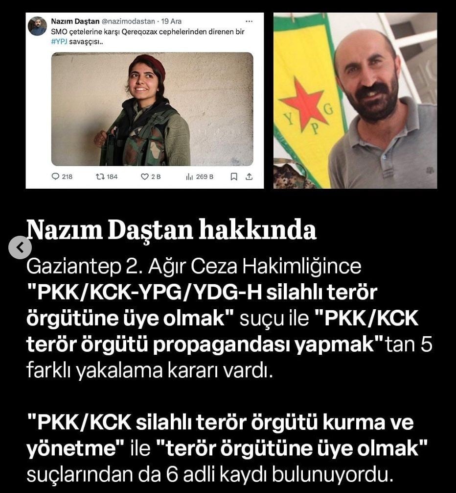 Nazım Daştan'ın PKK/YPG terör örgütü üyeleriyle güncel irtibatı tespit edildi. Öte yandan, Cihan Bilgin’in 2015 yılında Diyarbakır PKK/KCK silahlı terör örgütü kurma yönetme ve üye olma kaydı bulunurken, Mardin 1.Sulh Ceza Hakimliğince PKK/KCK-PYD/YPG silahlı terör örgütüne üye olmaktan arandığı öğrenildi.