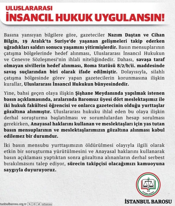 Bakırköy Cumhuriyet Başsavcılığınca hazırlanan iddianamede, haklarında "PKK/KCK/YPG/YDG-H silahlı terör örgütüne üye olmak" ve "terör örgütü propagandası yapmak" suçlarından soruşturma yürütülen ve kamu davasında yargılanırken Suriye'de güvenlik güçleriyle girdikleri çatışmada etkisiz hale getirilen terör örgütü mensubu Nazım Daştan ve Cihan Bilgin'e yönelik İstanbul Barosuna ait sosyal medya hesabından açıklama yapılması üzerine soruşturma başlatıldığı aktarılmıştı.