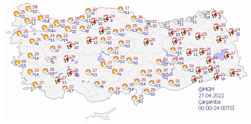 Meteoroloji Genel Müdürlüğü tarafından yapılan son değerlendirmelere göre; Ülkemizin kuzey ve doğu kesimlerinin parçalı ve çok bulutlu, Doğu Anadolu ile Edirne çevreleri, Kırklareli'nin batısı, Sivas, Bayburt, Kayseri'nin doğusu, Kastamonu ve Karabük’ün güneyi, Siirt, Batman çevreleri ve Mardin'in doğu kesimlerinin yerel olmak üzere sağanak ve gök gürültülü sağanak yağışlı geçeceği tahmin ediliyor. Sabah ve gece saatlerinde Marmara'nın güney ve doğusu ile Orta ve Doğu Karadeniz kıyılarında yer yer pus ve sis hadisesi bekleniyor. Güneydoğu Anadolu ile Hatay ve Osmaniye çevrelerinde yer yer toz taşınımı bekleniyor.