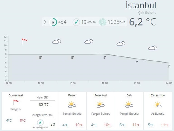 İstanbul hava durumu ile ilgili rüzgar uyarısında bulunan Meteoroloji Genel Müdürlüğü hava sıcaklıklarının 4 derecelere kadar düşeceğini belirtti. İl genelinde 5 gün boyunca en yüksek sıcaklık ise 11 derece olacak. Hafta boyunca parçalı bulutlu havanın hakim olacağı şehirde yağış ise beklenmiyor.