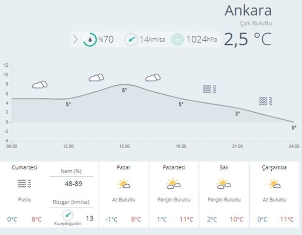Ankara hava durumu ile ilgili yaptığı uyarılarda havanın puslu olacağını hatırlatan MGM sıcaklıkların eksi 1 derecelere kadar düşeceğini belirtti. İl genelinde yüksek sıcaklığın 11 derece olacağı Ankara’da önümüzdeki 5 gün boyunca yağış beklenmiyor.