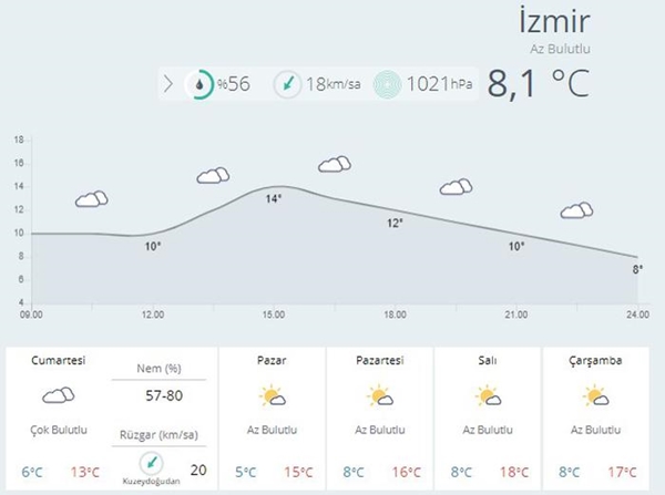 İzmir hava durumu hava sıcaklıklarının 5 dereceye kadar ineceği şehirde rüzgarın saatteki hızının 20 km’ye kadar çıkacağını gösterdi. Salı gününe doğru en yüksek sıcaklık değerinin görüleceği İzmir’de hava sıcaklığı gündüz saatlerinde 18 derece olacak.