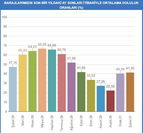 1 Şubat Pazartesi günü İstanbul barajlarının ortalama doluluk oranı yüzde 41,30 olarak ölçüldü. Su miktarı Istrancalar'da yüzde 63,42, Terkos'ta yüzde 40,67, Sazlıdere'de yüzde 19,53, Alibey'de yüzde 52,07, Büyükçekmece'de yüzde 44,33, Ömerli'de yüzde 45,76, Darlık'ta yüzde 54,69, Elmalı'da yüzde 49,79, Kazandere'de yüzde 48,56 ve Pabuçdere'de yüzde 13,51 olarak kaydedildi.