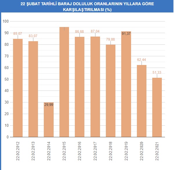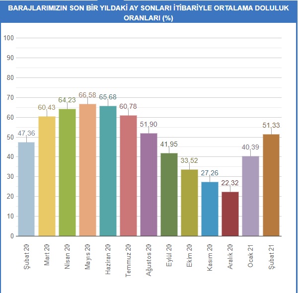 İstanbul Su ve Kanalizasyon İdaresi (İSKİ) verilerine göre, barajlardaki su seviyesi 8 Ocak'ta yüzde 19,16'ya kadar inerken, aradan geçen sürede yağışlarla yüzde 32,17 arttı. Kar yağışının başladığı 12 Şubat Cuma gününden bu yana ise barajlardaki doluluk oranı yüzde 5 yükseldi. İstanbul’a su sağlayan barajlardaki doluluk oranı 22 Şubat Pazartesi itibarıyla yüzde 51,33 olarak ölçüldü.