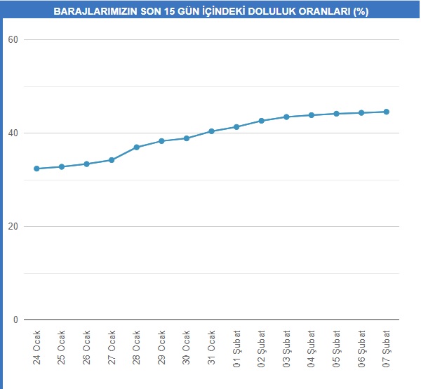 7 Şubat Pazar günü İSKİ verilerine göz attığımızda İstanbul baraj doluluk oranı yüzde 44,55 olarak ölçüldü. İstanbul barajlarının halen yüzde 55,45 boş durumda. Bu sebeple vatandaşların yaz aylarında zorluk yaşanmaması için su tüketiminde dikkatli olmaları, bilinçli su tüketimini alışkanlık haline getirmeleri son derece önemli.