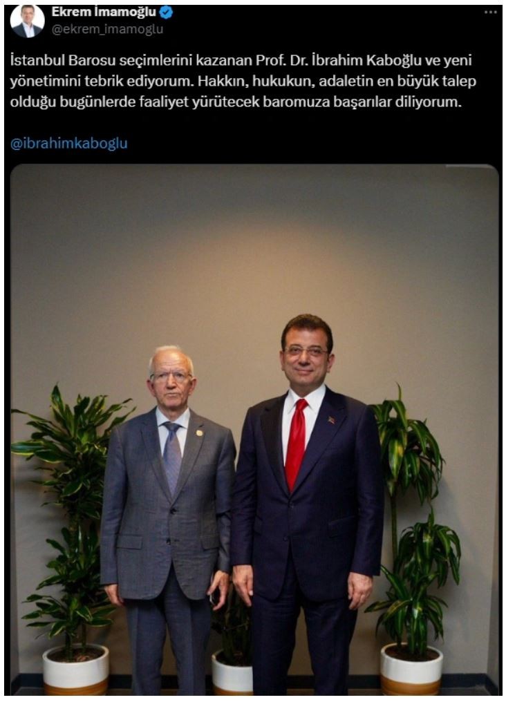 İBB Başkanı Ekrem İmamoğlu, X hesabından "İstanbul Barosu seçimlerini kazanan Prof. Dr. İbrahim Kaboğlu ve yeni yönetimini tebrik ediyorum. Hakkın, hukukun, adaletin en büyük talep olduğu bugünlerde faaliyet yürütecek baromuza başarılar diliyorum." açıklamasında bulundu.