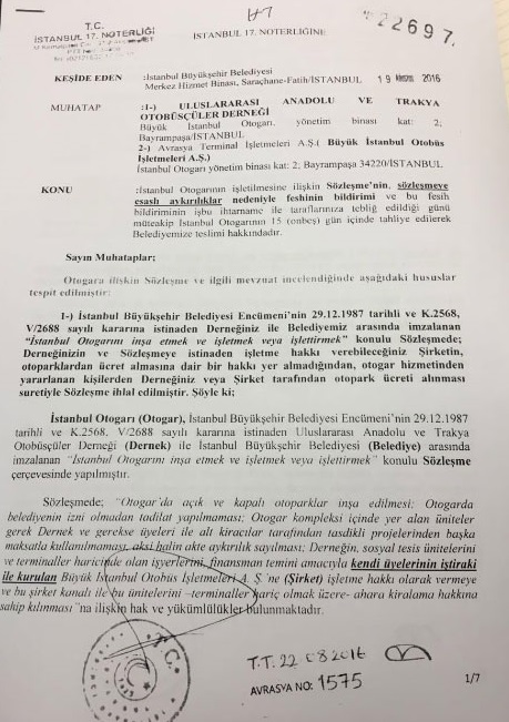 İBB tarafından 9 Ağustos 2016 tarihinde İstanbul 17. noterliği aracılığıyla Avrasya Terminal İşletmeleri Şirketi'ne gönderilen tahliye tebligatında, "Yolcu taşıma işleri yapan şirketlerin kullandığı iş yerleri ile otogar hizmetlerinden yararlanacak kişilerin bu hizmetten yararlanırken kullandıkları otoparkların hukuki durumları birbirinden farklıdır. Sözleşmede tanınan hak çerçevesinde otogarı yapacak olan işletme hakkı devredilecek ve kiralanacak yerler arasında otoparklar bulunmamaktadır." ifadeleri yer aldı.