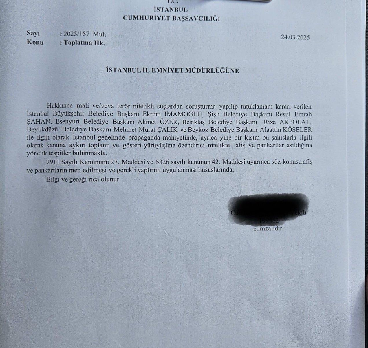 İstanbul Cumhuriyet Başsavcılığı, emniyete yazı yazarak başta Ekrem İmamoğlu olmak üzere Resul Emrah Şahan, Ahmet Özer, Rıza Akpolat, Mehmet Murat Çalık ve Alaattin Köseler’in kentte bulunan afişlerinin toplatılması talimatını verdi.