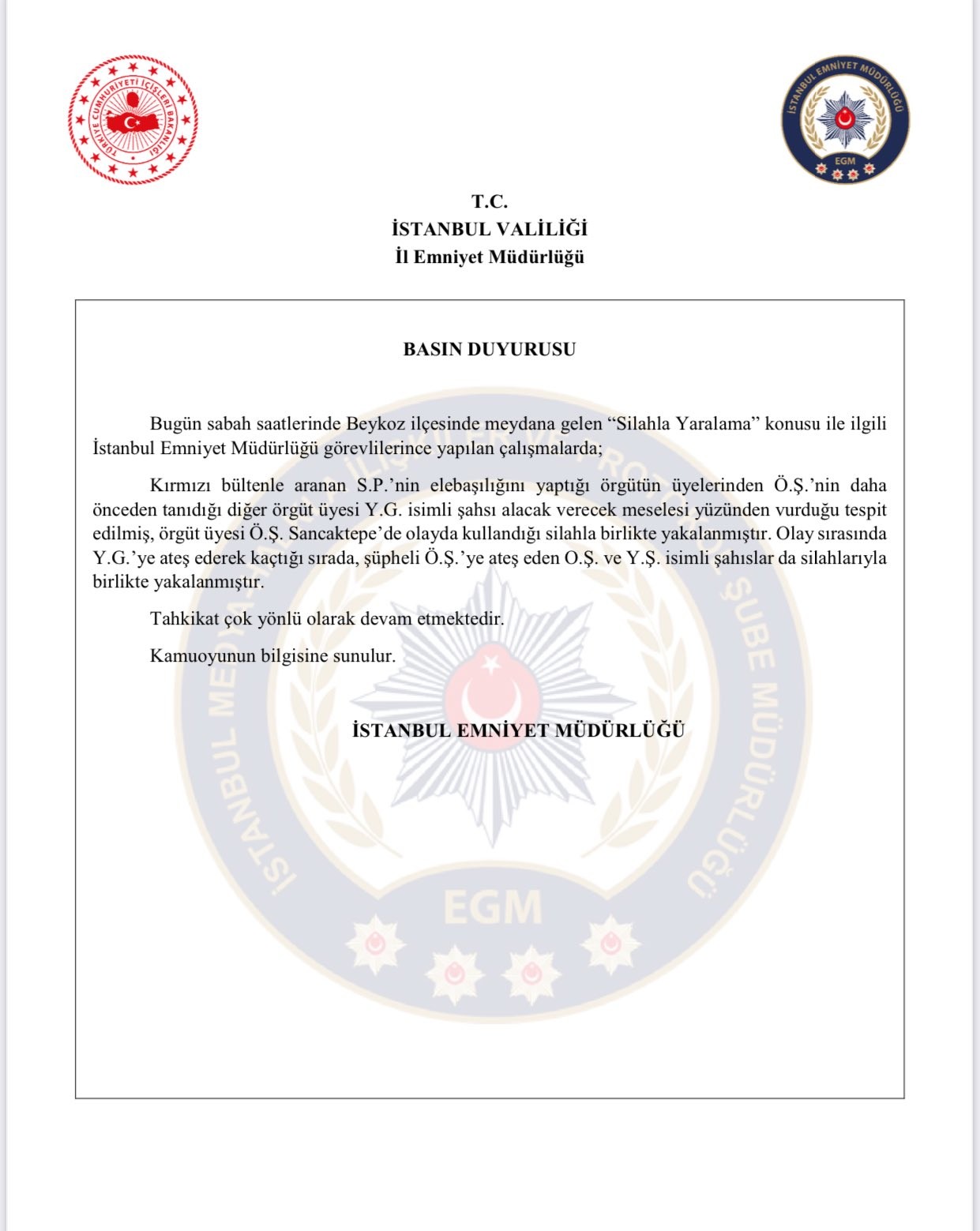 Kırmızı bültenle aranan S.P.'nin elebaşılığını yaptığı örgütün üyelerinden Ö.Ş.'nin daha önceden tanıdığı diğer örgüt üyesi Y.G. isimli şahsı alacak verecek meselesi yüzünden vurduğu tespit edilmiş, örgüt üyesi Ö.Ş. Sancaktepe'de olayda kullandığı silahla birlikte yakalanmıştır.