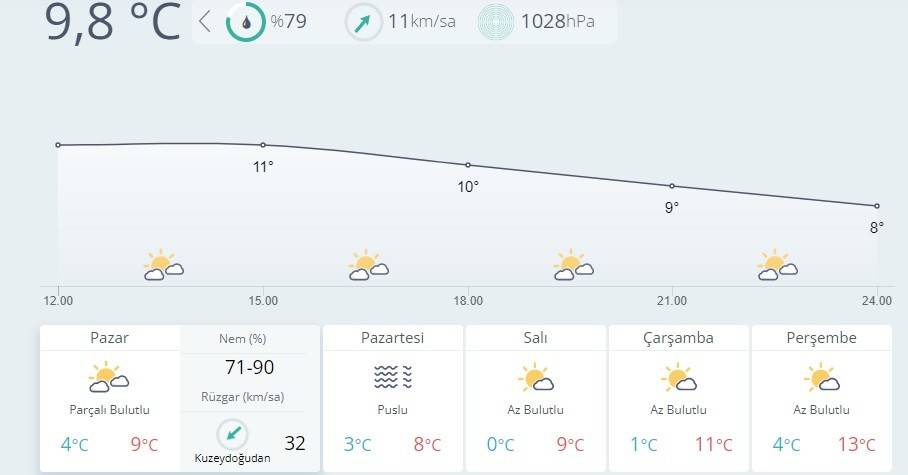 Az bulutlu, zamanla parçalı bulutlu geçeceği tahmin ediliyor. Sabah ve gece saatlerinde buzlanma ve don olayı ile birlikte pus, yer yer sis hadisesinin görülmesi bekleniyor.