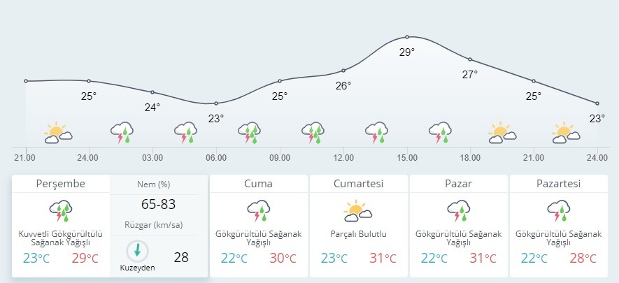 Meteoroloji Genel Müdürlüğü tarafından yapılan son değerlendirmelere göre: Ülkemizin kuzey, iç ve batı kesimlerinin parçalı, yer yer çok bulutlu, Marmara'nın doğusu, İç Ege ve Muğla, Akdeniz'in iç kesimleri ve İskenderun Körfezi Çevreleri, Batı Karadeniz, (Bayburt hariç) Doğu Karadeniz ve Ankara, Kırıkkale, Ardahan ile Eskişehir'in güney ve doğu, Çankırı'nın batı çevrelerinin yerel sağanak ve gök gürültülü sağanak yağışlı, diğer yerlerin az bulutlu ve açık geçeceği tahmin ediliyor. Yağışların, bu akşam saatlerinde Eskişehir'in güney, Ankara'nın güney ve batı çevrelerinde ve yarın İstanbul, Yalova ve Bartın çevrelerinde kuvvetli, İstanbul'un Anadolu Yakası, Kocaeli, Sakarya, Düzce ve Zonguldak çevrelerinde çok kuvvetli ve yer yer şiddetli olması bekleniyor.