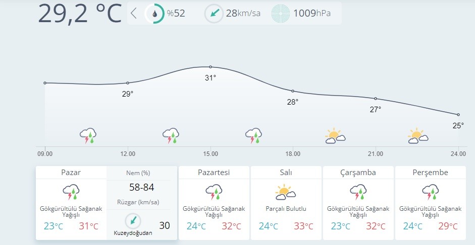 Meteoroloji Genel Müdürlüğü tarafından yapılan son değerlendirmelere göre: Parçalı, yer yer çok bulutlu, Trakya kesimi, İstanbul, Kocaeli, Yalova ve Çanakkale çevreleri ile Balıkesir'in kuzey kıyılarının yerel olmak üzere sağanak ve gök gürültülü sağanak yağışlı geçeceği tahmin ediliyor. Rüzgarın, bölgenin batısında kuzey ve kuzeydoğu yönlerden yer yer kuvvetli olarak (30-60 km/saat) esmesi bekleniyor.