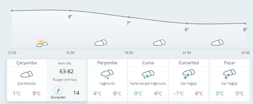 Çok bulutlu, aralıklı karla karışık yağmur ve kar yağışlı geçeceği tahmin ediliyor. Yağışların yer yer kuvvetli olması bekleniyor.