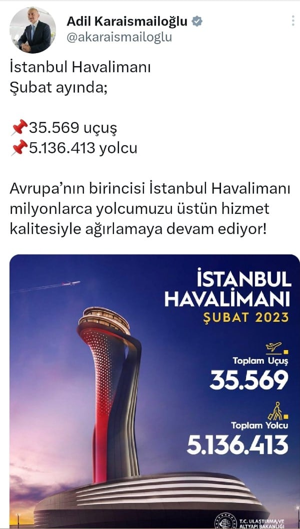 Konuyla ilgili sosyal medya hesabından bir açıklama yapan Ulaştırma ve Altyapı Bakanı Adil Karaismailoğlu, "İstanbul Havalimanı şubat ayında, 35.569 uçuş, 5.136.413 yolcu. Avrupa'nın birincisi İstanbul Havalimanı milyonlarca yolcumuzun üstün hizmet kalitesiyle ağırlamaya devam ediyor" paylaşımında bulundu.