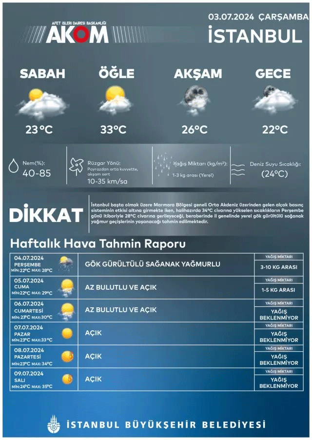 Konuya ilişkin İstanbul Büyükşehir Belediyesi Afet İşleri Dairesi Başkanlığı'ndan da (AKOM) yapılan uyarıda, yarın megakentte metrekareye 3 ila 10 kilogram arasında yağış düşmesinin beklendiği açıklandı. Rüzgarın ise poyrazdan orta kuvvette, akşam ise sert eseceği duyuruldu.