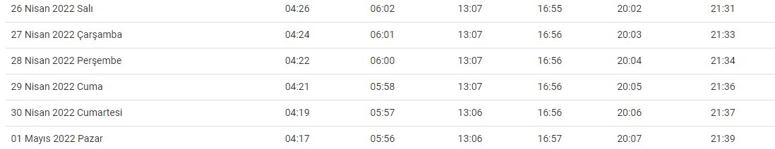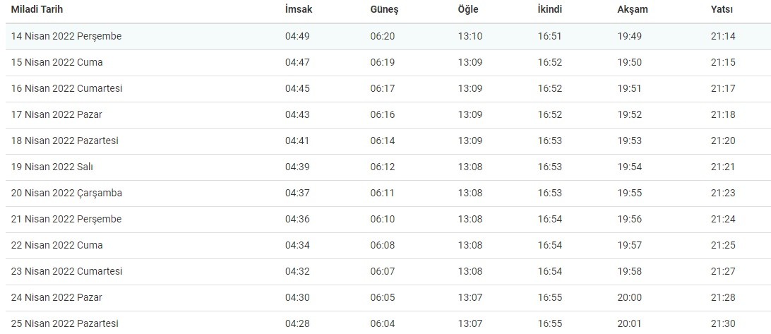 İstanbul'da 14 Nisan Perşembe akşam ezanı saat 19.45'te okunacak.