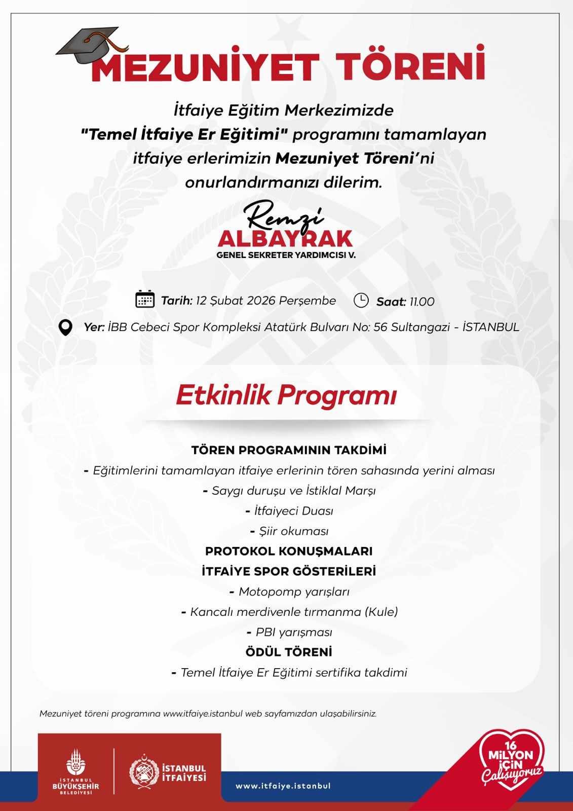 Tepkiler sonrası yeni kararlar alan İBB İstanbul İtfaiyesi 12 Şubat Perşembe günü de mezuniyet töreni düzenleyecek. Törene ilişkin ayrıntılarda kamuoyu ile paylaşıldı.