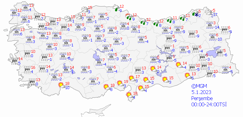 Meteoroloji Genel Müdürlüğü tarafından yapılan son değerlendirmelere göre: Ülkemizin kuzey ve doğu kesimlerinin parçalı ve çok bulutlu, Karadeniz kıyıları, İstanbul'un Anadolu Yakası, Yalova, Kocaeli ve Sakarya çevreleri ile Kastamonu kıyılarının yağmurlu, Ordu, Giresun, Trabzon, Rize ve Artvin çevrelerinin iç ve yüksek kesimlerinin karla karışık yağmur ve kar yağışlı, diğer yerlerin az bulutlu ve açık geçeceği tahmin ediliyor. Marmara’da yer yer yoğun olmak üzere, iç ve doğu kesimlerde yer yer pus ve sis bekleniyor.