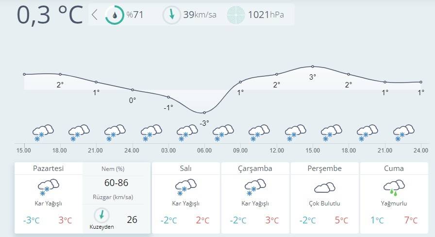Meteoroloji Genel Müdürlüğünden yapılan yazılı açıklamaya göre, halen aralıklarla devam eden kar yağışlarının gelecek 3 gün boyunca il genelinde etkisini sürdüreceği tahmin ediliyor.