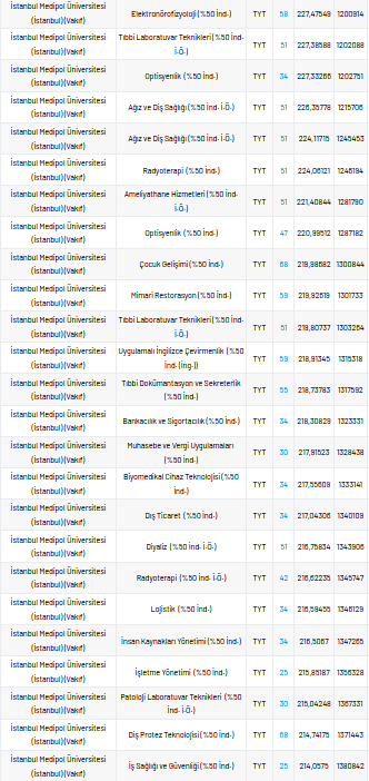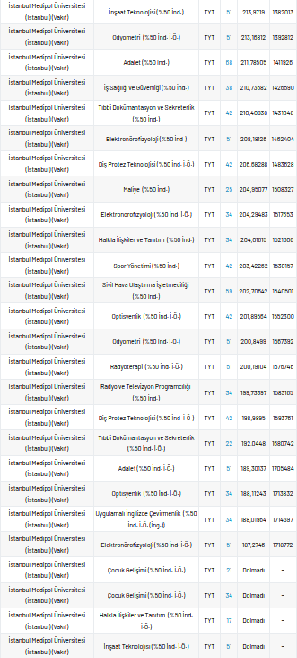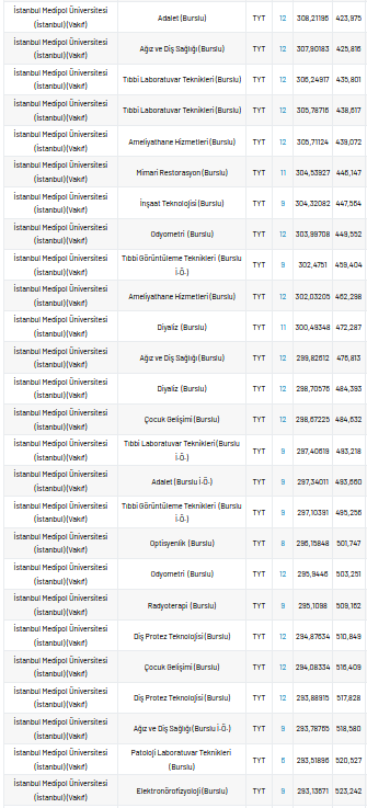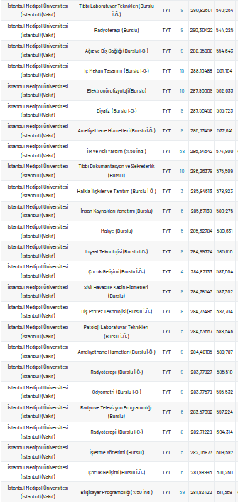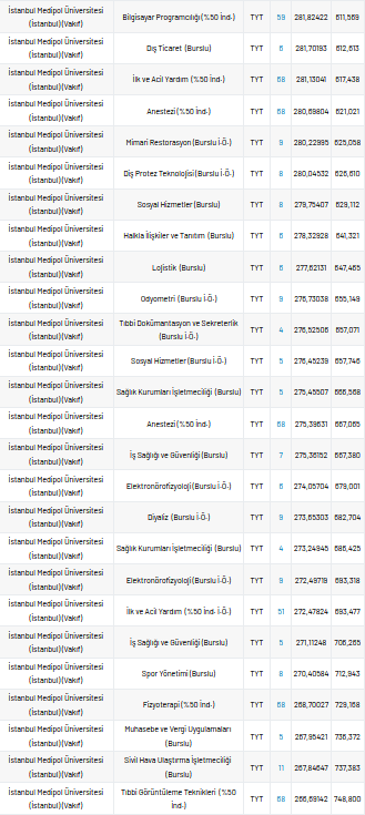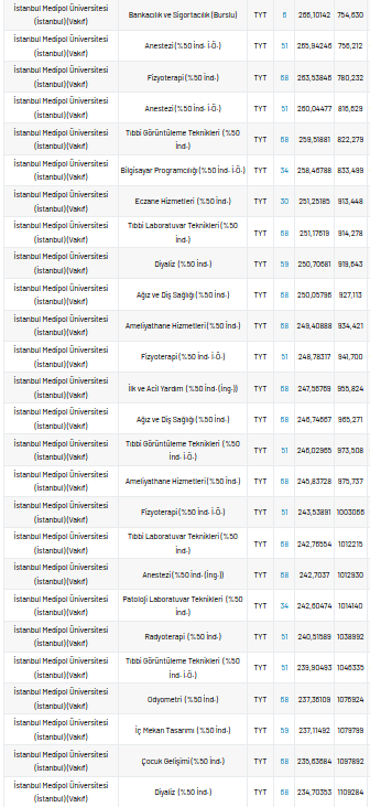 İstanbul Medipol Üniversitesi 2 yıllık taban puanları 2021, yüzdelik dilimleri ve kontenjan sayıları kaçtır?