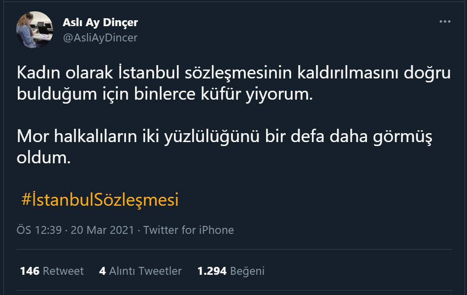 Şahsi Twitter hesabından bir paylaşım yapan Aslı Ay Dinçer, “Kadın olarak İstanbul sözleşmesinin kaldırılmasını doğru bulduğum için binlerce küfür yiyorum. Mor halkalıların iki yüzlülüğünü bir defa daha görmüş oldum.” ifadelerini kullandı.