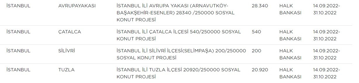 TOKİ projesi başvuru ücreti 500 TL olarak belirlendi. Vatandaşlar başvuru aşamasında konut tipini seçemiyorlar. Başvurular Halkbank ve Ziraat Bankası üzerinden 31 Ekim’e kadar yapılabilecek. e-Devlet üzerinden başvuru işlemi ise 28 Ekim’de sona erecek. Vatandaşlar ikametlerinin bulunduğu şehirler için konut başvurusunda bulunabiliyor. TOKİ’nin İstanbul’da yapacağı konutların bulunduğu ilçeler ise şöyle: