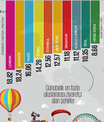Küresel uluslararası turizm gelirinin ise 1 trilyon 245 milyar dolar seviyesini yakaladığı gözleniyor. İstanbul, küresel turizm ekonomisindeki bu genişlemeden en fazla pay alan şehirlerden biri olarak karşımıza çıkıyor. Örneğin 2015 yılı için açıklanan, tek günlük en popüler uluslararası destinasyonlar sıralamasında İstanbul, Londra, Bangkok, Paris ve Dubai'den sonra beşinci sırada yer alıyor.