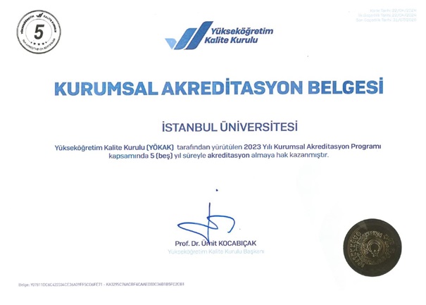 Bu önemli başarıyla birlikte İstanbul Üniversitesi, YÖKAK tarafından tanımlanan liderlik, yönetişim, kalite, eğitim-öğretim, araştırma-geliştirme ve toplumsal katkı gibi alanlarda belirlenen ölçütleri dikkatle inceleyen bir değerlendirme sürecinden geçmiş ve üstün başarı göstererek 5 yıl süreyle Tam Akreditasyon Belgesi almaya hak kazanmıştır.