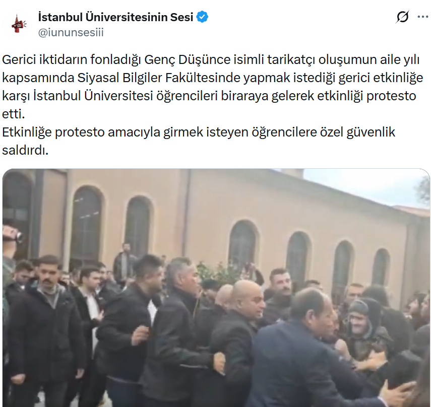 İstanbul Üniversitesi’nde Genç Düşünce topluluğunun “aile yılı” kapsamında Siyasal Bilgiler Fakültesinde yapmak istediği etkinlik, kendilerini “aile yılı etkinliği gericiliktir” diye tanımlayan bir kesimin müdahalesiyle engellenmeye çalışıldı. Etkinlik alanına ‘aile yılı’ etkinliğini protesto etmek isteyen grup, eylemlerini “anayasal hak” olarak duyururken, ortaya çıkan görüntüler sosyal medyada büyük tepki topladı.