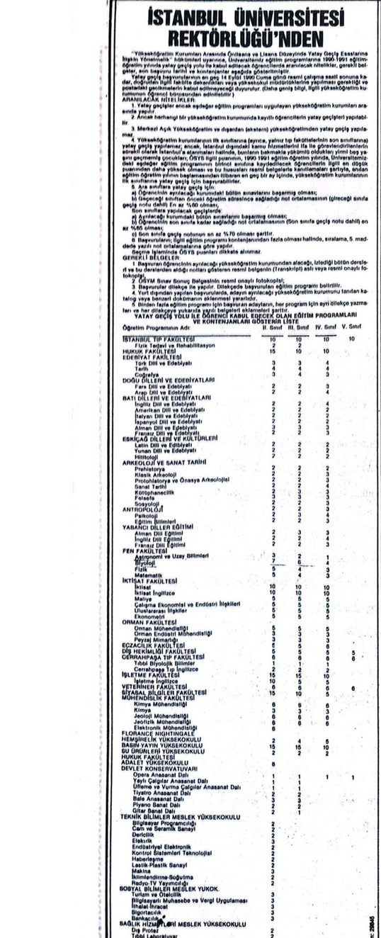 Ancak ardından dün Rektör Zülfikâr’ın Ekrem İmamoğlu meselesini “anlamak” için 1990-91 öğretim yılı için 30 Temmuz 1990 tarihli Milliyet gazetesinde yayınlanan bir ilânı istettiğini ve bu ilânın masasında durduğunu öğrendim. İlânda yatay geçiş yapmak isteyenlere son başvuru tarihinin 14 Eylül 1990 olduğu ve yatay geçiş için İngilizce İşletme bölümünün ikinci sınıfına 10 öğrencinin alınacağı belirtiliyor. Yani Ekrem İmamoğlu’nun hak etmediği halde kayıt yaptırdığı sınıfa. Üçüncü ve dördüncü sınıflar için ise bu sayı 5 kişi. İlan aşağıda: