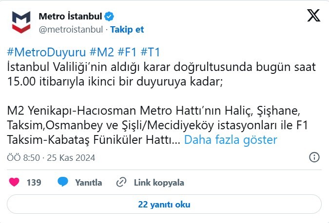 İstanbul Valiliği tarafından yapılan açıklamada, ikinci bir duyuruya kadar metro seferleri ve bazı istasyonların işletmeye kapatılacağı duyuruldu!