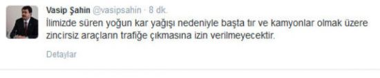 İstanbul Valisi Vasip Şahin Twitter'dan yaptığı açıklamada, "İlimizde süren yoğun kar yağışı nedeniyle başta tır ve kamyonlar olmak üzere zincirsiz araçların trafiğe çıkmasına izin verilmeyecektir." dedi.