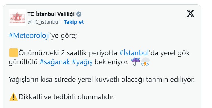 Valiliğin sosyal medya hesabından yapılan açıklamada, MGM'nin uyarısı hatırlatılarak, "Meteoroloji’ye göre; önümüzdeki 2 saatlik periyotta İstanbul'da yerel gök gürültülü sağanak yağış bekleniyor. Yağışların kısa sürede yerel kuvvetli olacağı tahmin ediliyor.Dikkatli ve tedbirli olunmalıdır" denildi.