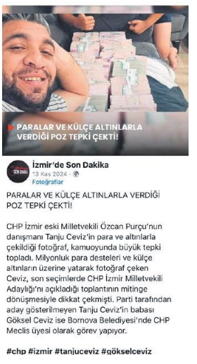 - Altınlı Poz: 13 Kasım 2024 tarihli bir fotoğrafta, Nerman Hafriyat adına çalışan ve eski bir CHP milletvekili danışmanı olan Tanju Ceviz’in, balya balya paralar ve külçe altınlarla poz verdiği görülüyor.