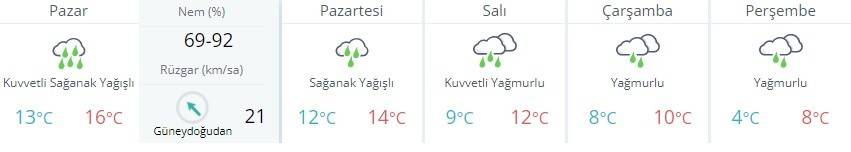 Meteorolojiden yapılan açıklamada, bu gece saatlerinde Trakya'da başlayacak sağanak ve yer yer gök gürültülü sağanağın, pazar sabah ilk saatlerden itibaren Trakya ile Çanakkale çevrelerinde, zamanla Marmara'nın batısı, Kıyı Ege ile Manisa çevrelerinde yerel olarak kuvvetli, Balıkesir’in batı kıyı ilçeleri, İzmir'in kuzey ilçeleri ile Çanakkale'nin güney ve doğu ilçelerinde çok kuvvetli ve yer yer şiddetli olmasının beklendiği belirtildi.