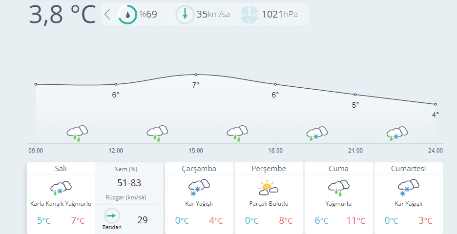 Parçalı ve çok bulutlu, öğle saatlerinden itibaren kar yağışı geçeceği tahmin ediliyor. Yağışların akşam saatlerinden itibaren yoğun kar şeklinde olması bekleniyor.