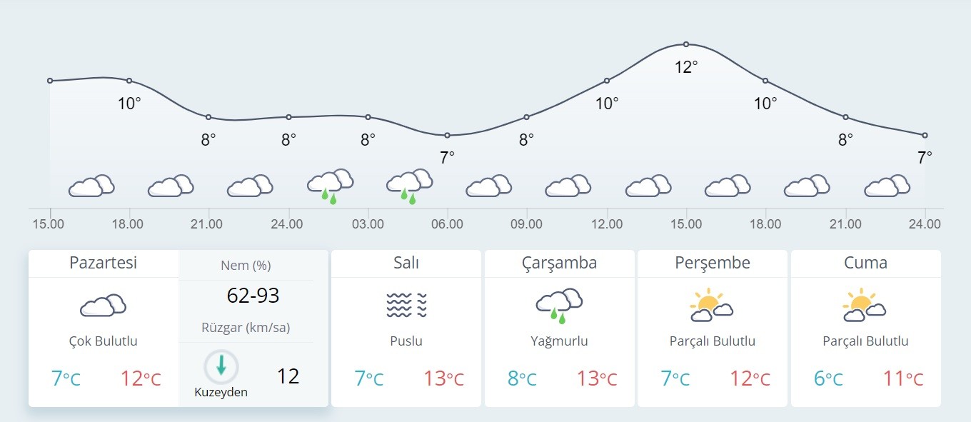 Meteoroloji Genel Müdürlüğü tarafından yapılan son değerlendirmelere göre: Marmara'nın doğusu, İç Anadolu, Batı ve Orta Karadeniz, Tekirdağ, Afyonkarahisar, Kütahya, Hatay ve Van çevreleri ile gece saatlerinde Kilis, G. Antep, Ş. Urfa ve Mardin çevrelerinin aralıklı yağışlı geçeceği tahmin ediliyor. Yağışların kıyı kesimler ile Güneydoğu Anadolu'nun güneyinde yağmur ve sağanak, yağış alan diğer yerlerde karla karışık yağmur ve kar şeklinde olması bekleniyor. Yağışların Zonguldak, Düzce, Karabük, Bartın, Bolu ile Kastamonu’nun kuzey kesimlerinde yer yer kuvvetli olması bekleniyor. Marmara ile İç ve doğu bölgelerde yer yer pus ve sis olayı bekleniyor.