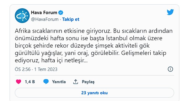 Hava Forum "Afrika sıcaklarının etkisine giriyoruz. Bu sıcakların ardından önümüzdeki hafta sonu ise başta İstanbul olmak üzere birçok şehirde rekor düzeyde şimşek aktiviteli gökgürültülü yağışlar, yani oraj, görülebilir" dedi.