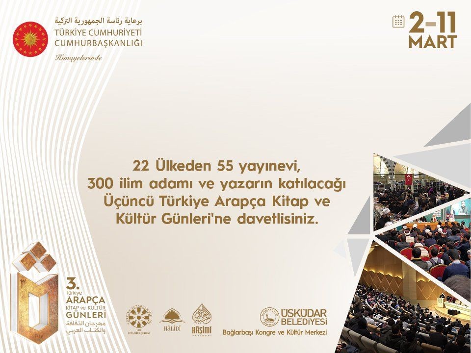 Üçüncü yılında Türkiye Cumhuriyeti Cumhurbaşkanlığı’nın himayesinde gerçekleştirilecek olan 3. Türkiye Arapça Kitap ve Kültür Günleri, TYB İstanbul Şubesi, Hâlidî Maarif İlim ve Kültür Derneği ve Hâşimî Yayınevi ortaklığında düzenleniyor. Daha önceki yıllarda olduğu gibi çok daha iddialı bir içerikle hazırlanan Kitap ve Kültür Günleri için Türkiye, Suriye, Suudi Arabistan, Irak, Lübnan, Ürdün, Mısır, Cezayir, Tunus, Fas, Sudan, Katar ve Küveyt’ten pek çok yayınevi ve yazar davet edildi.