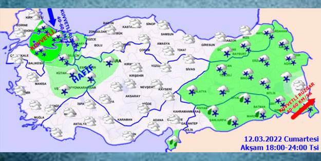 Türkiye'yi etkisi altına alan Aybar kar yağışı sistemi İstanbul'da etkisini hafta sonu da devam ettirirken, yeni haftayla birlikte yerini yağmura bırakması bekleniyor. Meteoroloji Genel Müdürlüğü tarafından yapılan değerlendirmelere göre ülke genelinin çok bulutlu, Marmara'nın doğusu, Doğu Karadeniz (Giresun hariç), Doğu ve Güneydoğu Anadolu ile Tekirdağ, Balıkesir, Kütahya, Uşak, Afyonkarahisar, Mersin, Adana'nın kuzey ve batısı, Osmaniye'nin güney ve doğusu, Hatay, Ankara, Eskişehir, Karaman, Niğde'nin güneyi, Bolu, Zonguldak, Karabük ve Düzce çevrelerinin aralıklı yağışlı geçeceği tahmin ediliyor.