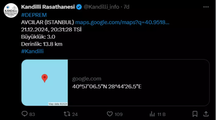 Kandilli Rasathanesi'nden elde edilen verilere göre, İstanbul'un Avcılar ilçesinde hissedilen bir deprem meydana geldi.
