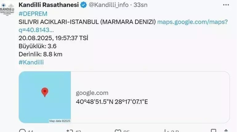 İstanbul ve çevresindeki bazı illerde hissedilen bir deprem oldu. Kandilli'den yapılan açıklamada depremin büyüklüğü 3.6 merkezi ise İstanbul'un Silivri açıkları olarak kaydedildi.