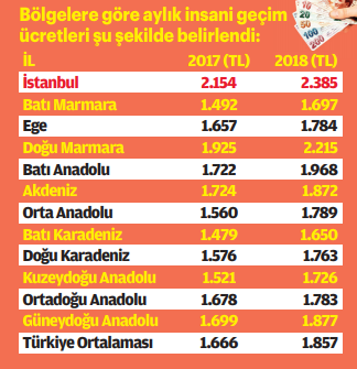 Türkiye İktisadi Girişim ve İş Ahlakı Derneği (İGİAD), 2018 yılı İGİAD, “2018 Yılı İnsani Geçim Ücreti (İGÜ)” araştırmasının sonuçlarını açıkladı. İGİAD Yönetim Kurulu Başkanı Ayhan Karahan, bireyi değil, 2 çocuklu bir ailenin onurlu yaşayabileceği, insanca geçinebileceği aylık asgari geçim ücretini esas aldığına işaret etti. Karahan, “2018 yılı için Türkiye’de 12 ayrı bölgenin insani geçim ücreti belirlendi. Buna göre en yüksek insani geçim ücreti 2 bin 385 lira ile İstanbul’dadır. En düşük ücret ise bin 650 liradır. Bu rakamın Türkiye ortalaması ise bin 857 liradır” diye konuştu.