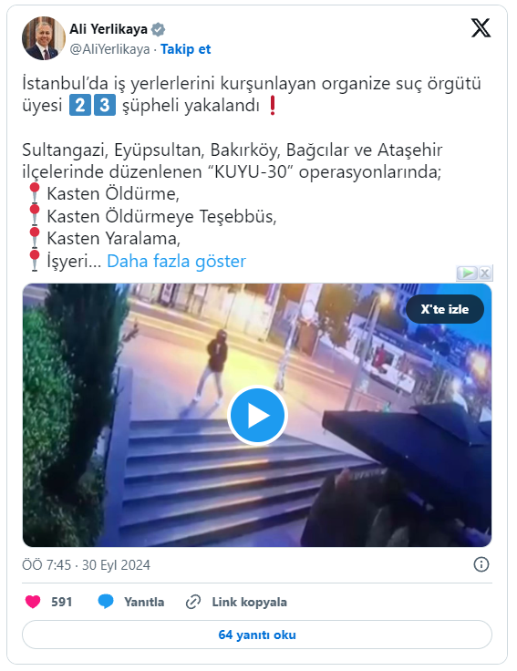 İçişleri Bakanı Ali Yerlikaya, İstanbul’da iş yerlerini kurşunlayan organize suç örgütü üyesi 23 şüphelinin yakalandığını sosyal medya hesabındaki paylaşımında açıkladı.