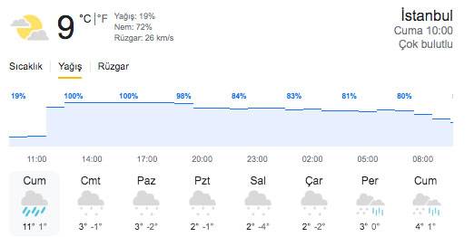 AKOM verilerine göre, 21 Ocak Cuma günü sabah saat 10.00 itibariyle, İstanbul'un büyük bölümünde kuvvetli yağmur, akşam saatlerinde Çatalca, Arnavutköy, Sarıyer, Beykoz ve Şile'de karla karışık yağmur, gece yarısı itibariyle de kentin tümünde kuvvetli kar yağışı bekleniyor.