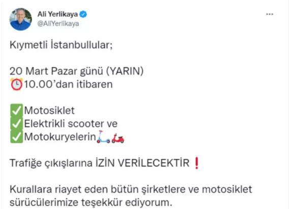 Vali Yerlikaya, Twitter hesabından yaptığı duyuruda, "20 Mart Pazar günü 10.00'dan itibaren motosiklet, elektrikli scooter ve motokuryelerin trafiğe çıkışlarına izin verilecektir. Kurallara riayet eden bütün şirketlere ve motosiklet sürücülerimize teşekkür ediyorum." ifadelerini kullandı.