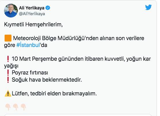 İstanbul Valiliği açıklamasında, "Öngörülen raporlar ve beklenen olumsuz hava koşulları nedeniyle; bütün eğitim kurumlarında eğitim faaliyetlerine 14 Mart 2022 Pazartesi gününe kadar ara verilmesine karar verildi" denildi. İstanbul Valisi Ali Yerlikaya, 10 Mart Perşembe gününden itibaren kuvvetli ve yoğun kar yağışının olacağını ifade etti.