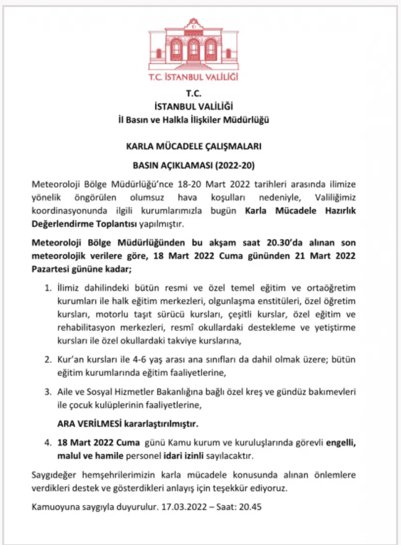 Yerlikaya, 18 Mart Cuma günü İstanbul'daki bütün resmi ve özel temel eğitim ve ortaöğretim kurumları ile halk eğitim merkezleri, olgunlaşma enstitüleri, özel öğretim kursları, motorlu taşıt sürücü kursları, çeşitli kurslar, özel eğitim ve rehabilitasyon merkezleri, resmi okullardaki destekleme ve yerleştirme kursları ile özel okullardaki takviye kurslarında eğitime ara verildiğini duyurdu.