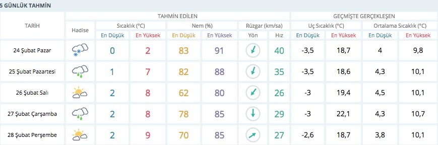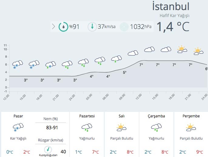 Meteoroloji Genel Müdürlüğünden alınan tahminlere göre, hava sıcaklığında önemli bir değişiklik olmayacak. Rüzgar, kuzeybatı kesimlerde kuzey ve kuzeydoğu, diğer yerlerde güneyli yönlerden hafif, ara sıra orta kuvvette, Marmara ve Kuzey Ege ile Batı Karadeniz’in batı kıyılarında kuvvetli ve yer yer kısa süreli fırtına (50-80 km/sa) şeklinde esecek. İstanbul’da en yüksek sıcaklıkları ise şöyle: Çok bulutlu, karla karışık yağmur ve kar yağışlı 3.