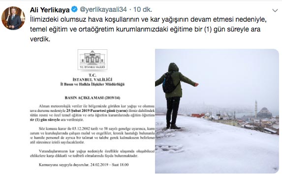 İstanbul'da okullar tatil mi 25 Şubat Pazartesi İstanbul valiliği twitter son dakika